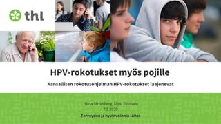 Web Neljäs Kansainväinen HPV-rokote koulutus Symbosium 2019 Chicago. HPV-rokotus on otettu kansalliseen rokotusohjelmaan tytöille vuonna 2013 ja pojille vuonna 2020. Web HPV-rokote kuuluu nykyisin kansalliseen rokoteohjelmaan sekä tytöillä että pojilla Rokotetta tarjotaan nyt kaikille 59-luokkalaisille pojille. HPV-rokote on tutkittu tehokas ja turvallinen Parhaan käytettävissä olevan tiedon.